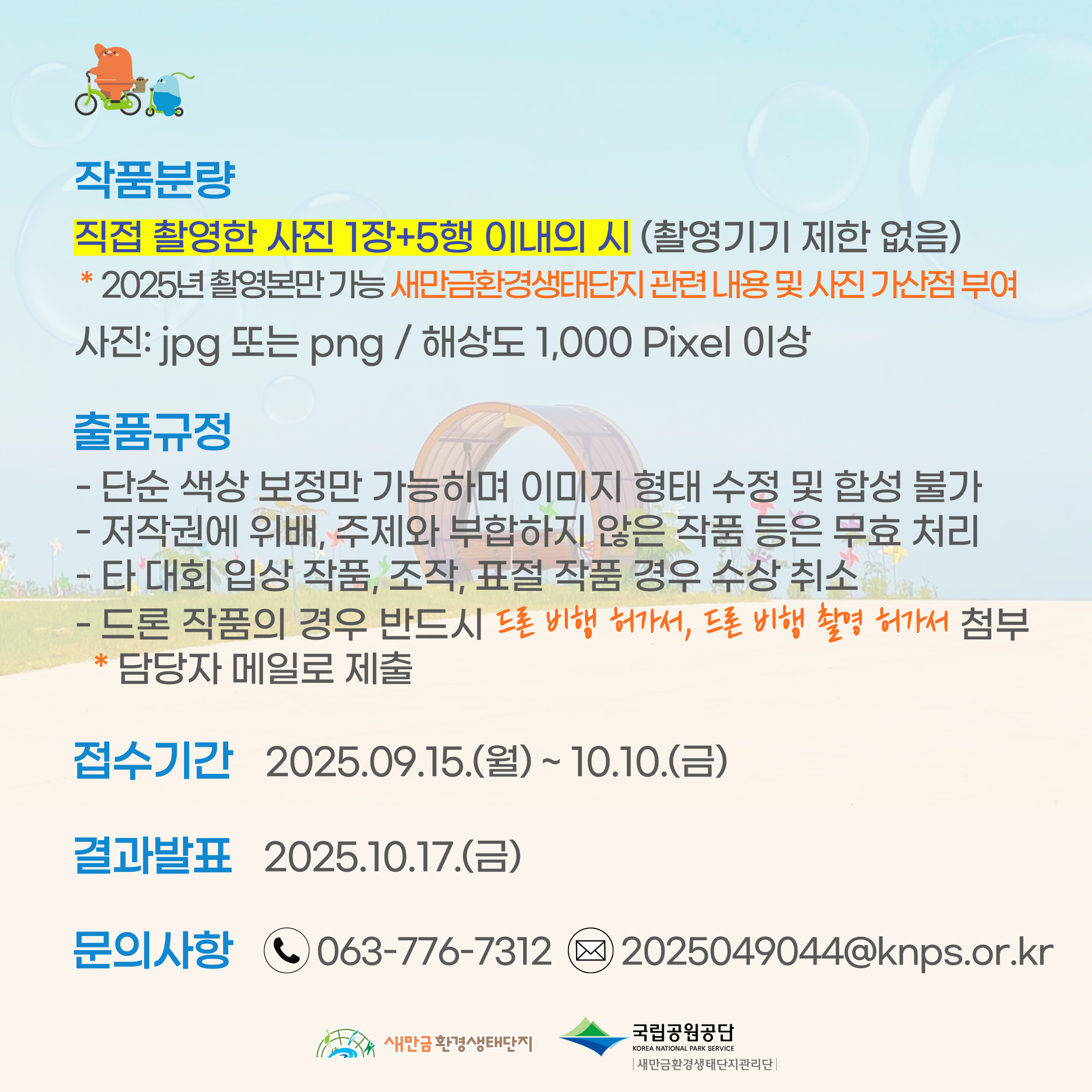 □ 결과발표: 2025. 10. 17.(금) / 새만금환경생태단지 누리집(홈페이지) 및 개별 연락