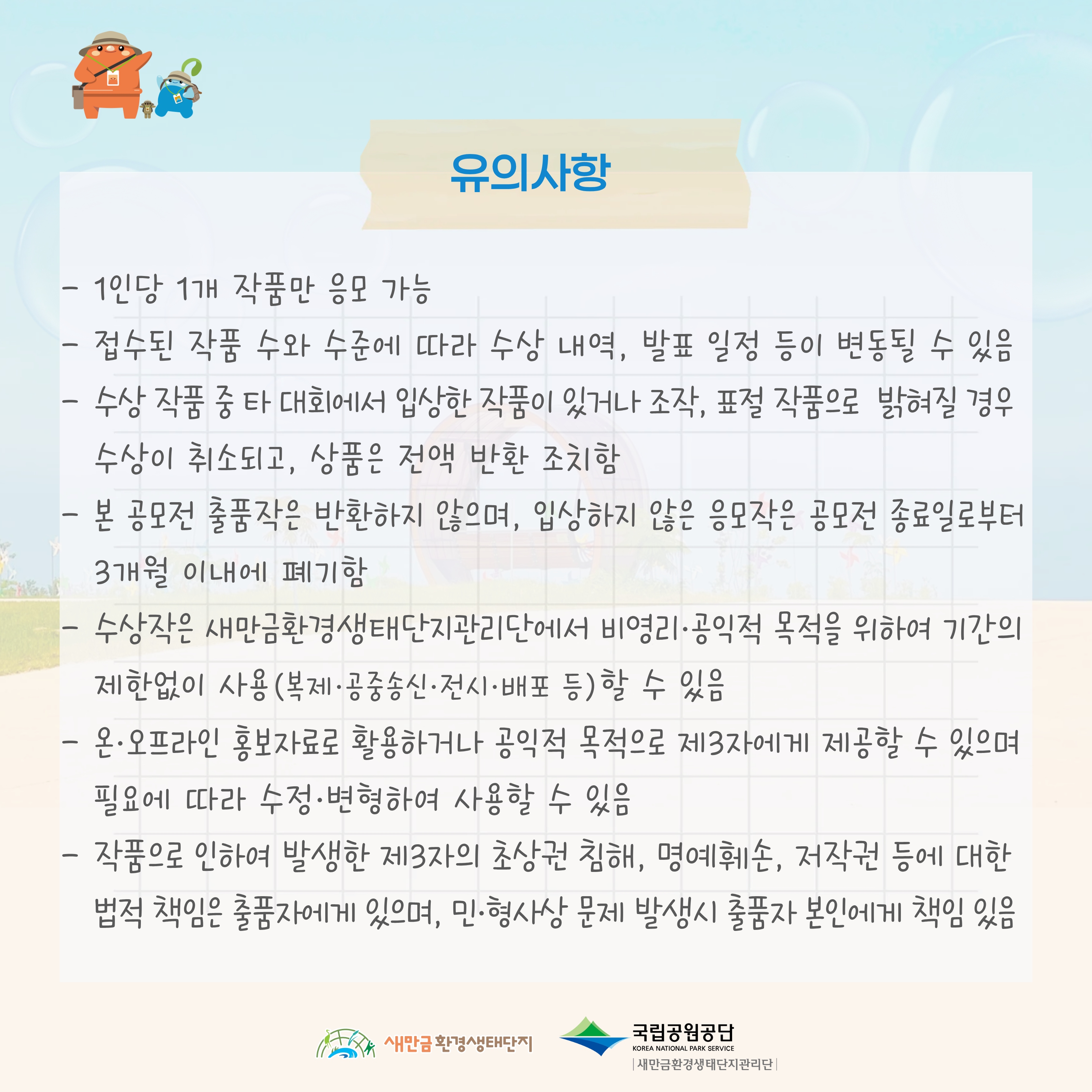 ○ 수상작은 국립공원공단 새만금환경생태단지관리단에서 비영리·공익적 목적을 위하여 기간의 제한 없이 사용(복제‧공중송신‧전시‧배포 등) 할 수 있음.